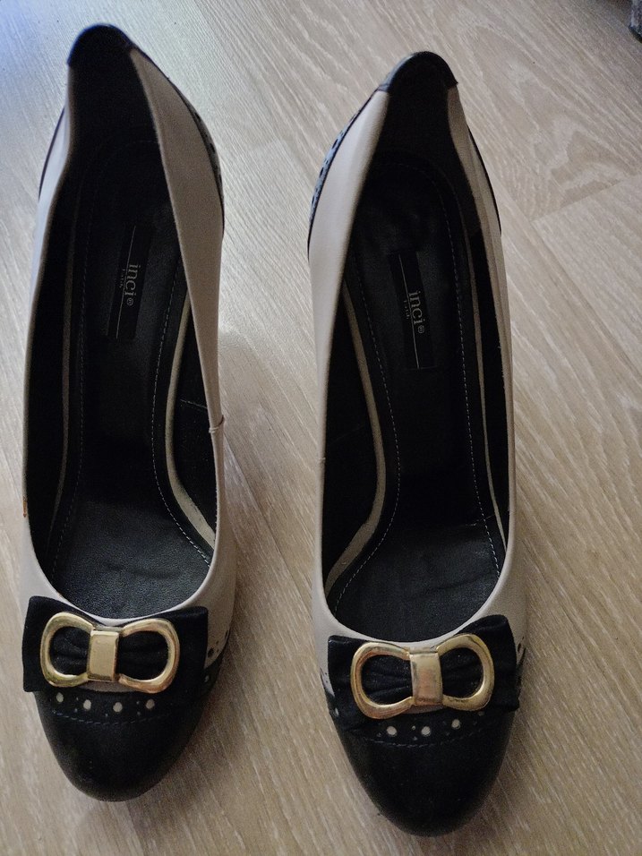 Bej ve siyah renkte, tokalı detaylı kadın topuklu klasik ayakkabı. Modern klasik tarzda, ofis için uygundur, tabanı kösele dir.. Sadece 1 kez giyilmiştir.