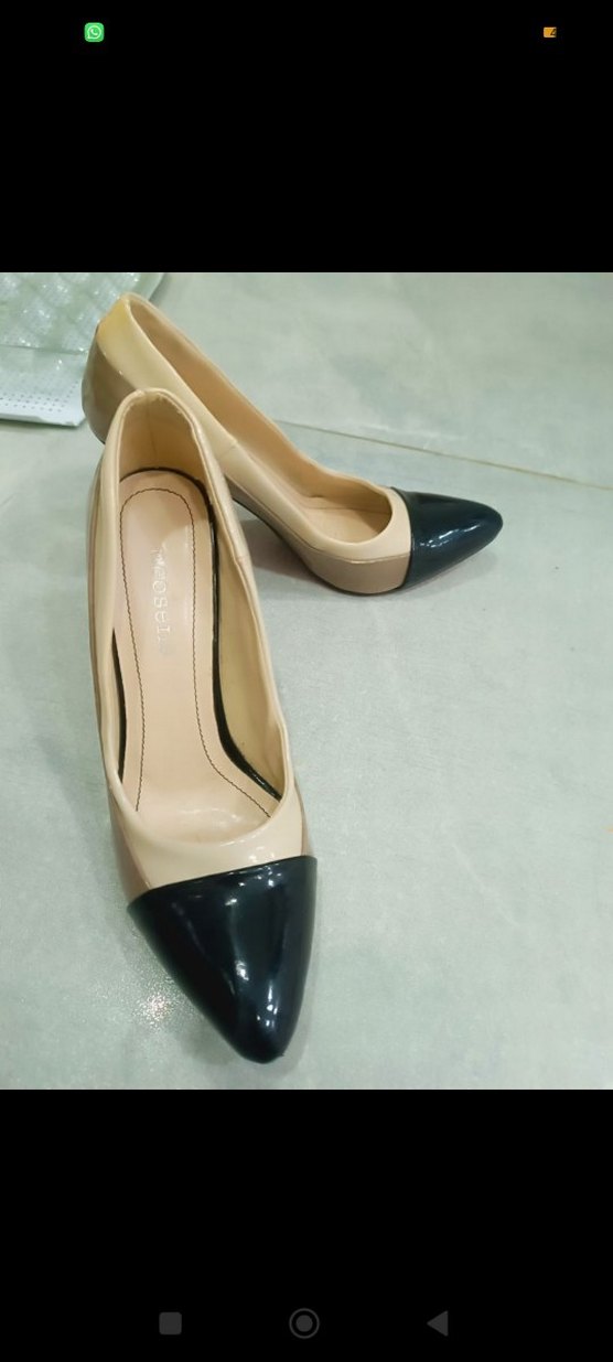 çok az giyildi. sorunu yoktur.Bej renkli, siyah uçlu stiletto topuklu kadın ayakkabısı. Düz ve pürüzsüz kauçuk malzemeden üretilmiş, klasik ve modern tarzı bir arada sunar. Ofis kullanımı için uygundur.