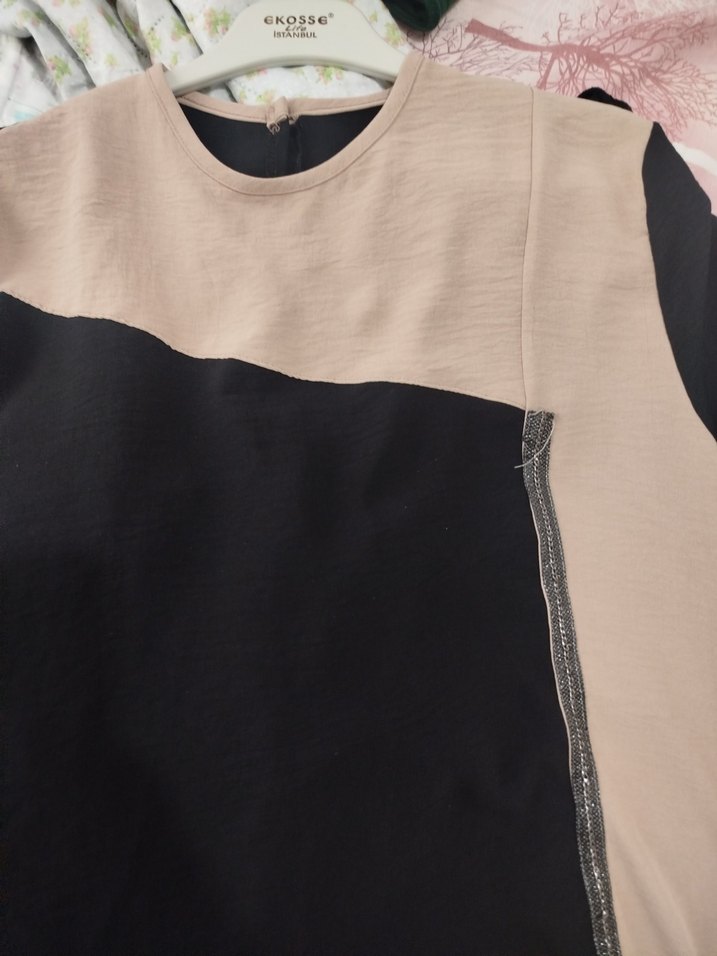 Bej ve siyah renklerde, yuvarlak yaka, uzun kollu, bol kesim tunik . Fermuarlı detayı ve sade tasarımıyla günlük kullanıma uygundur.