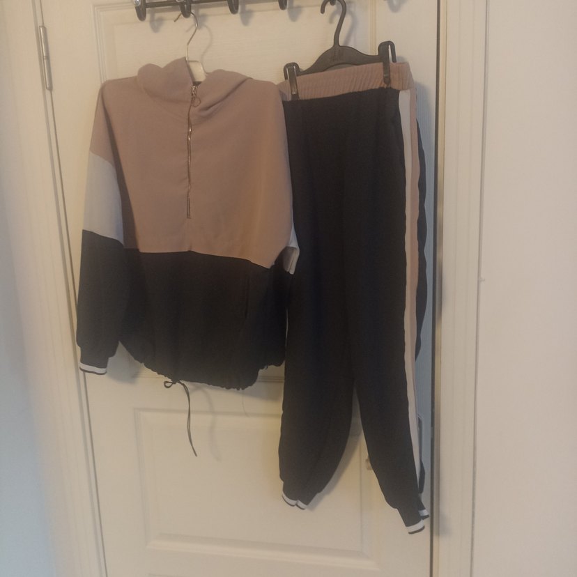 Bu kadın ceketi bol kesim, uzun boy ve yüksek yakaya sahiptir. Uzun kollu, fermuarlı ve sentetik kumaştan yapılmıştır. Bej ve siyah renk bloklarıyla günlük kullanıma uygun