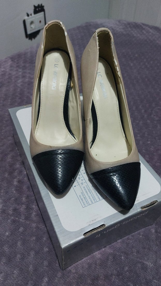 Bej renkte, siyah yılan desenli burunlu ve tasarıma sahip kauçuk malzemeden yapılmış stilettolar. Ofis için çağdaş Paris tarzı. arka kısımda az dökülme olmuş ama topuk ve alt sağlam çok giyilmedi