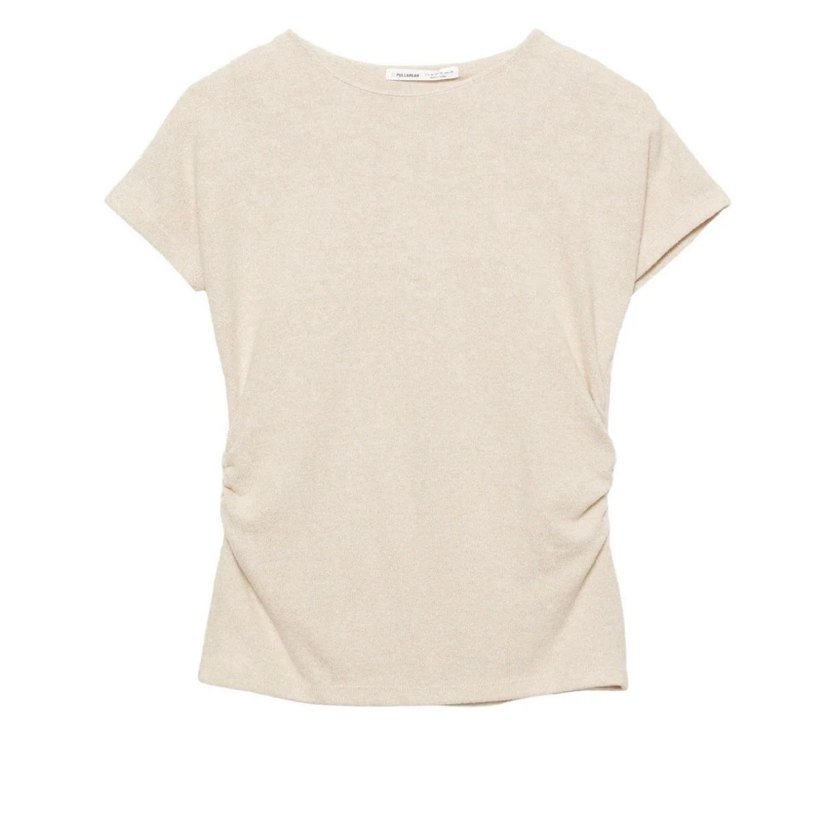 Bej renkte , kısa kollu ve yuvarlak yaka kadın tişörtü. Minimalist ve desensiz tasarımla günlük kullanım için uygun.