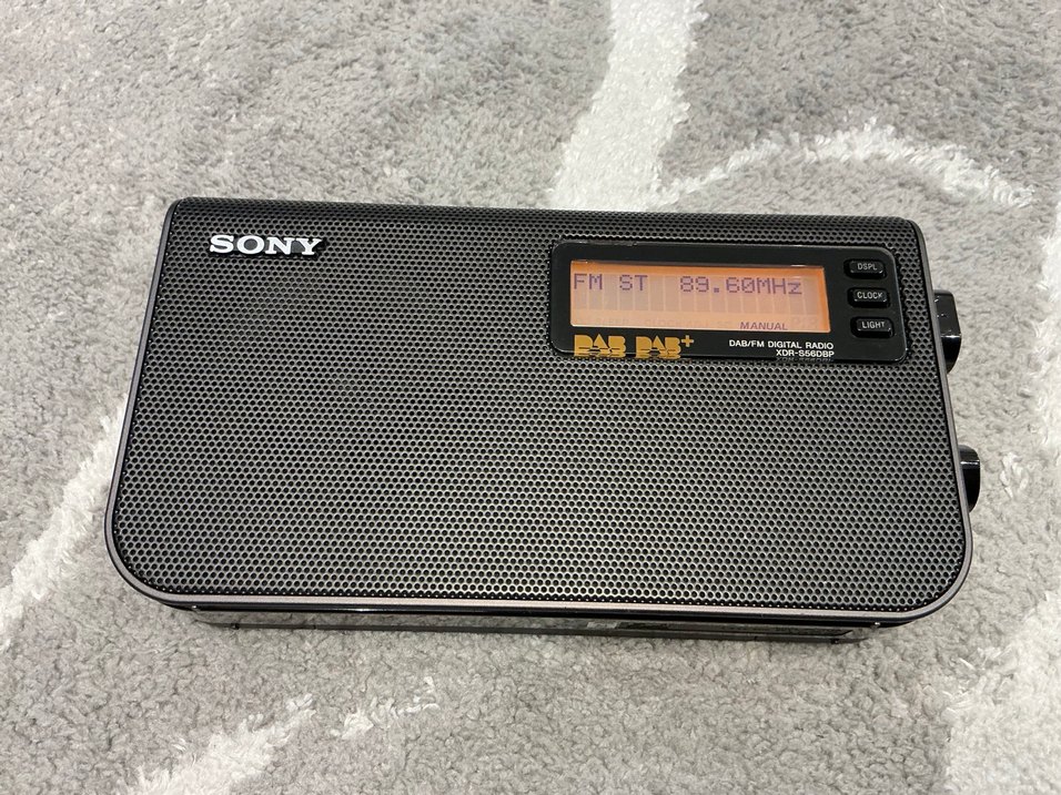 Bej renkli Sony müzik sistemi, 89.60 MHz FM stereo frekansında net dijital ekran ve manuel ayar özelliklerine sahiptir. DAB/DAB+ desteği bulunur.