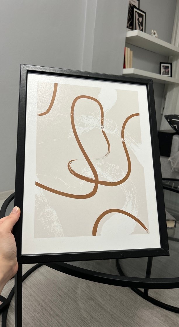 Bu tablo, bej tonlarda koyu soyut akışkan çizgilerle minimalist bir stil sunar. Siyah çerçevelidir. 40x60