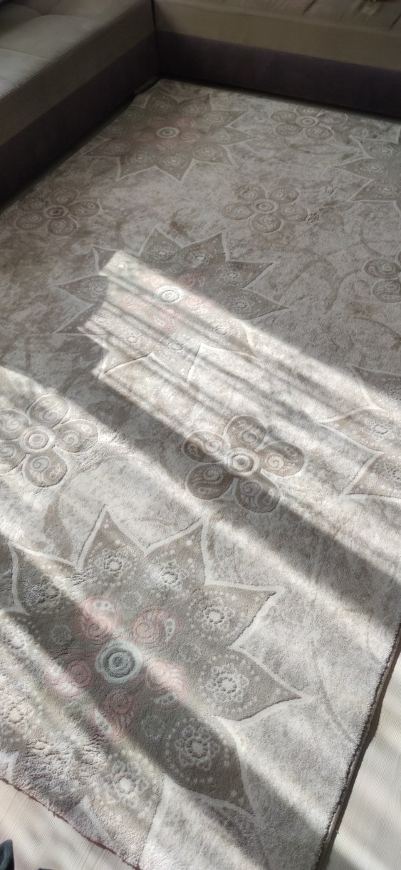 Bej renkli, gri tonlarda soyut desene sahip bohem tarzı halı, mekâna sanatsal bir dokunuş katar. halı kirlidir yıkanması gerek