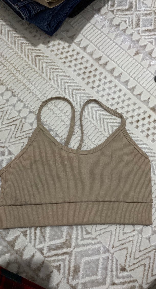 İnce askılı, bej renkte, kabartmalı dokulu spor sütyeni. Athleisure ve sokak tarzına uygun. ️♀️