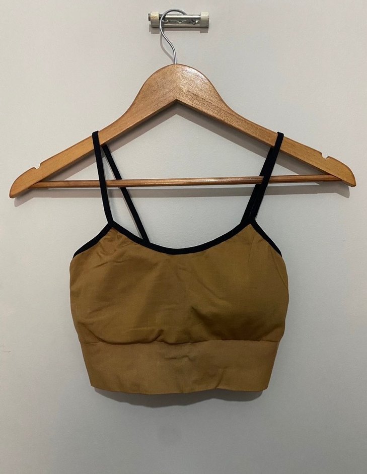 Bej renkte, siyah ince askılı, deseniz ve rahat kumaştan yapılmış spor sütyeni, midi uzunlukta ve streetwear tarzında.