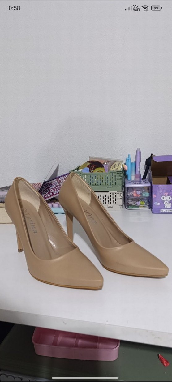 Bej renkte stiletto topuklu ayakkabı. Kauçuk malzemeden, modern klasik iş tarzına uygun.