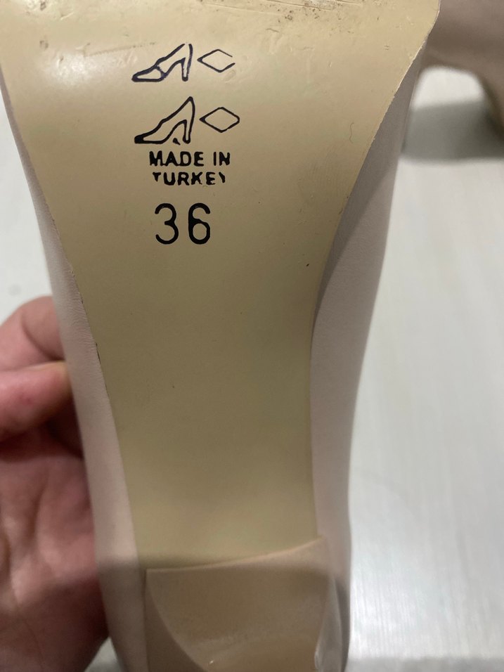Bej renkte, tokalı ve baskılı desenli stiletto kadın ayakkabısı, kauçuk tabanlı. Numara 36, Türkiye'de üretilmiştir. İçinde kalıbı vardır iki kere giydim sadece kalıp çıkabiliyor.