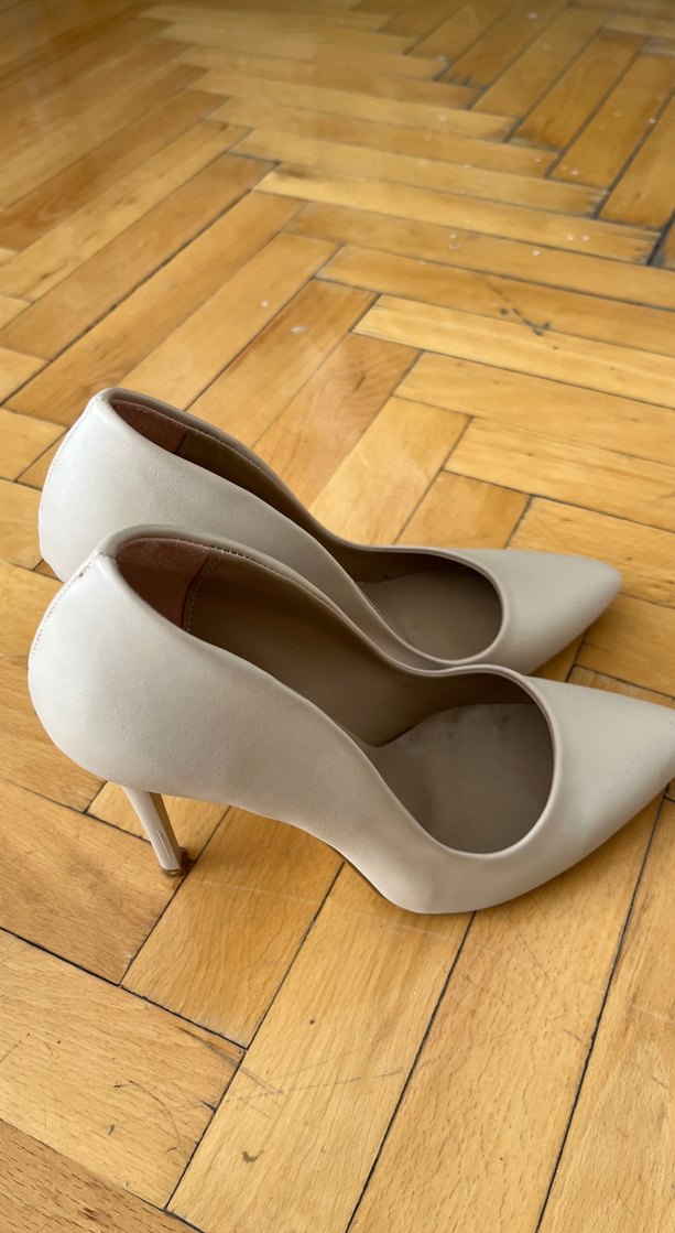 Bej renkte, minimalist tasarımlı, kauçuk malzemeden stiletto topuklu kadın ayakkabı. Ofis kullanımı için modern klasik ve zahmetsiz şıklık sunar.