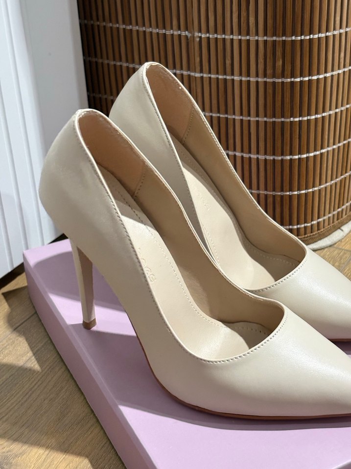Bej renkte, lastik malzemeden yapılmış, desen içermeyen stiletto topuklu kadın ofis ayakkabısı. Modern klasik ve zahmetsiz şıklık sunar.