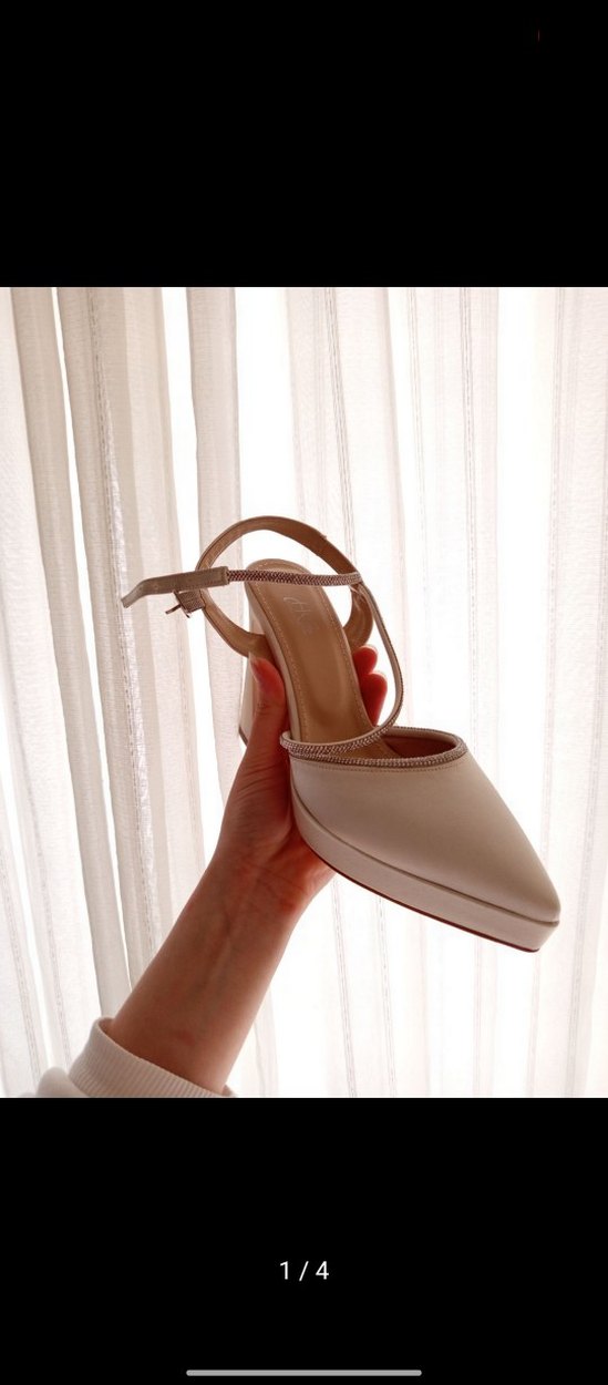 Bej renkte, tokalı ve lastik malzemeden yapılmış stiletto topuklu kadın abiye ayakkabı. Modern klasik ve minimal tasarıma sahip, düğünler için uygundur.