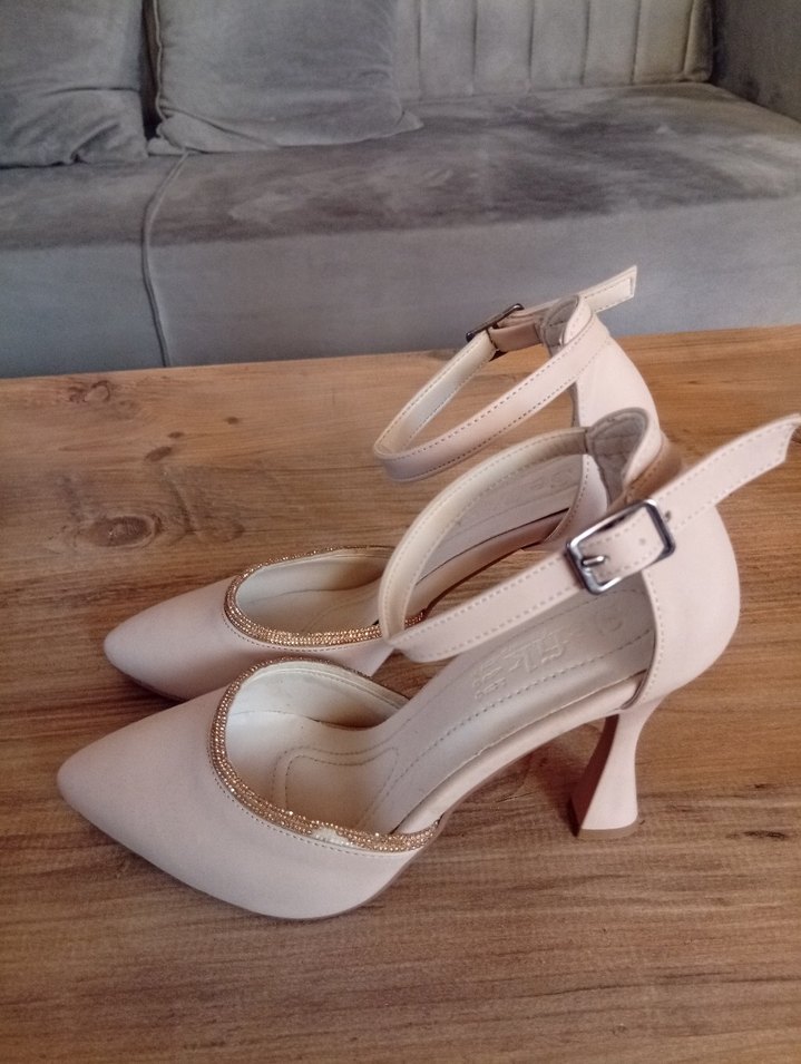 Bej renkte, tokalı bilek kayışlı, düz desensiz tasarıma sahip stiletto topuklu ayakkabı. Kauçuk malzemeden üretilmiş, modern klasik tarzda, düğünlere uygun.Topuk boyu 10 cm dir.Marka temsilidir.