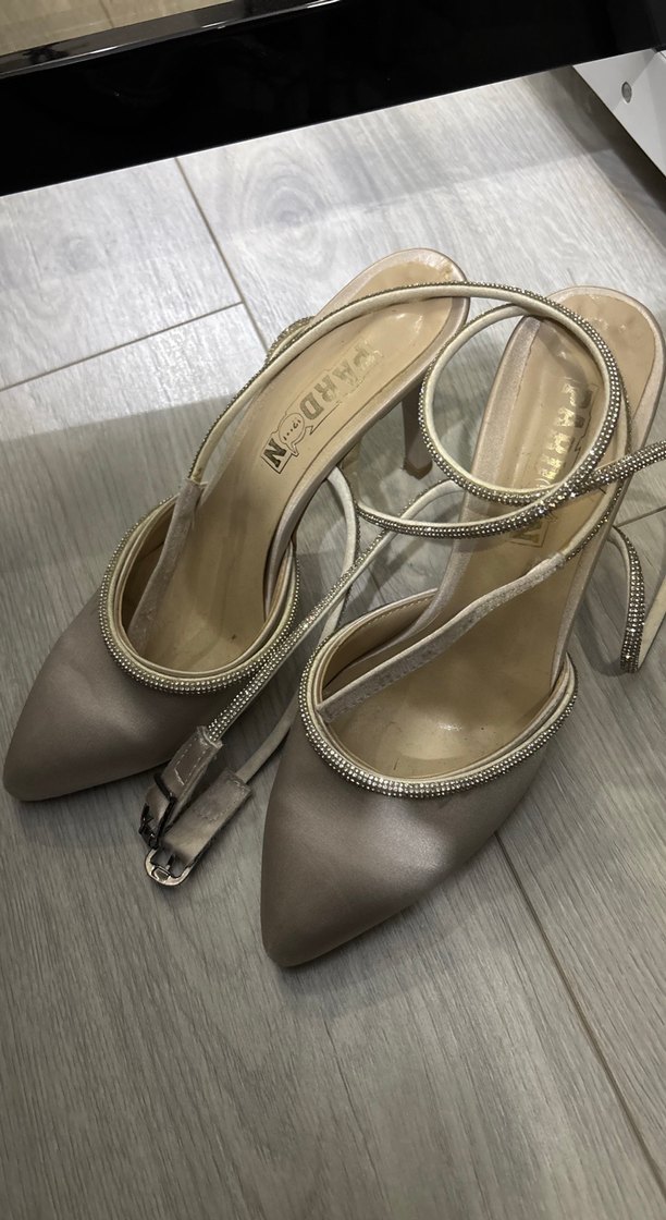 Bej rengi, saten dokulu ve yılan desenli stiletto topuklu ayakkabı. Tokalı kayışı ile modern klasik tarzda, Paris esintili, düğünler için uygun.
