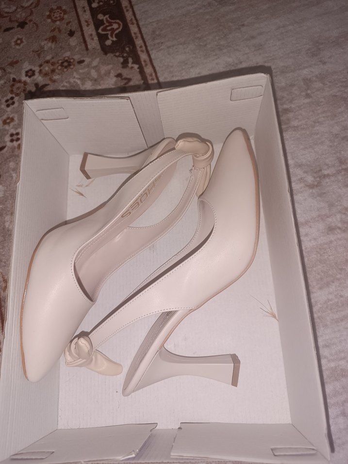 Yumuşak kauçuk malzemeden yapılmış, fiyonk detaylı bej stiletto topuklu ayakkabı, düğünler için uygun.