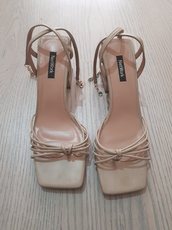 Bej stiletto topuklu, minimal tasarımlı, tokalı kayışlara sahip sade kadın ayakkabısı. Klasik günlük kullanıma uygundur.