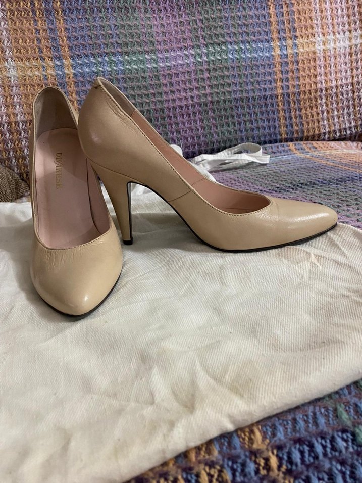 Bej renkte, kauçuk malzemeden yapılmış, desen içermeyen stiletto topuklu ayakkabılar. Ofis için uygun, çağdaş ve zahmetsiz şıklık sunar. hic giyilmedi durmaktan önleri biraz yıpranmıs