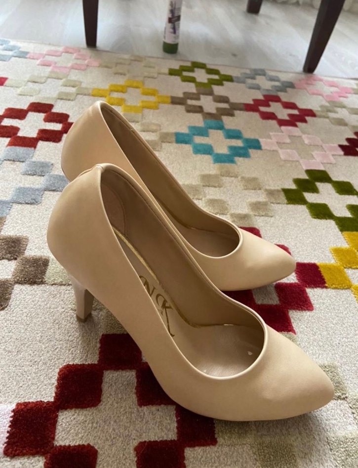 Marka temsilidir. Sadece ev içerisinde giyildi, dışarıda giyilmedi..Bej renkte, desen içermeyen, düğünler için uygun stiletto topuklu ayakkabılar..