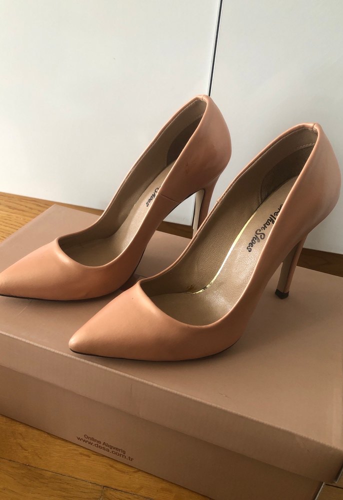 Bej renkte, kauçuk malzemeden yapılmış, modern klasik tarzda stiletto topuklu ayakkabı. Ofis için minimalist ve şık tasarım.