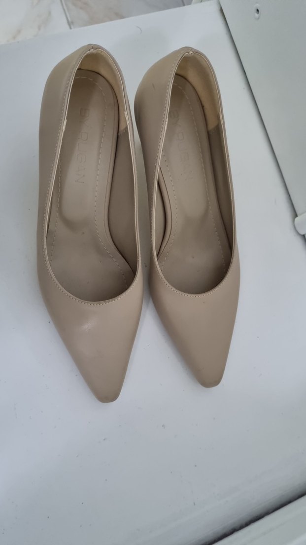 Bej renkte, minimalist tasarımlı, kauçuk malzemeden yapılmış stiletto topuklu ayakkabılar. Ofis ortamı için uygun, çağdaş ve zahmetsiz şık görünüm sunar.