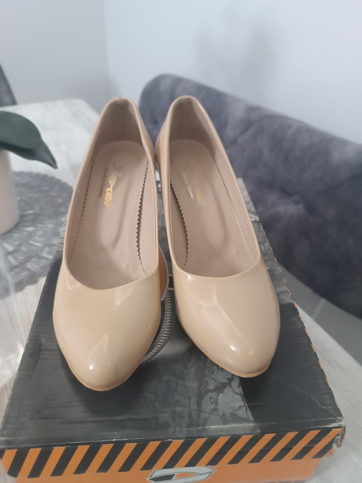 1 kere düğünde giyildi Düz bej renkte, kauçuk malzemeden yapılmış stiletto topuklu kadın ayakkabısı. Modern klasik tarzıyla ofis için şık ve rahat bir seçim.