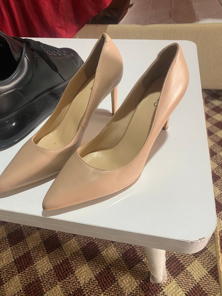 Bej renkte, kauçuk malzemeden yapılmış, ofise uygun, zarif ve çağdaş stilettolar. Takasta yok