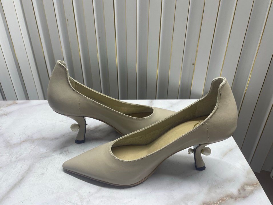 Bej renkte, düz ve çağdaş tasarıma sahip stiletto topuklu ayakkabılar. Ofis kullanımı için uygun, minimalist ve şık bir görünüme sahiptir.