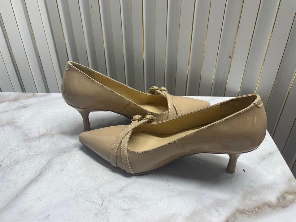 Bej renkte, kauçuk malzemeden yapılmış, desensiz stiletto topuklu ayakkabılar. Modern klasik tarzda, ofis kullanımı için uygun, zahmetsiz şıklık sunar.