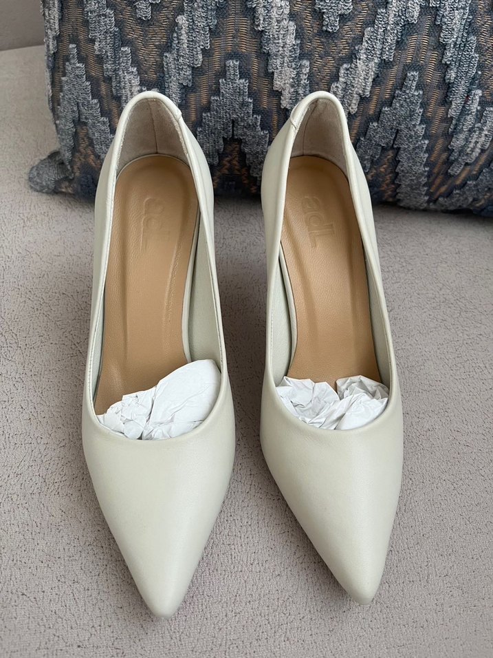 Modern klasik tarzda, beyaz stiletto topuklu kadın ayakkabı. Düz yüzeyli, kauçuk malzemeden üretilmiş, ofis için uygun, zahmetsiz şıklık sunar.
