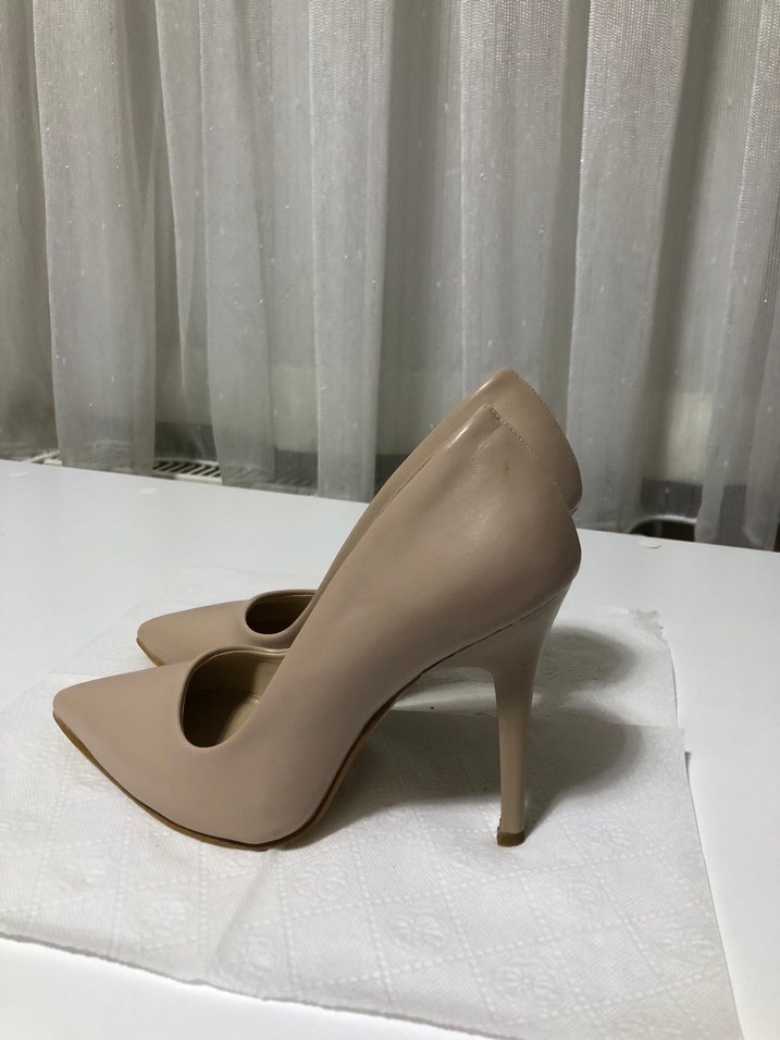 Bej renkte, kauçuk malzemeden yapılmış, minimal tasarımlı stiletto topuklu kadın ayakkabısı. Ofis ortamına uygun, pastel tonlarda, zahmetsiz şıklık sunar.
