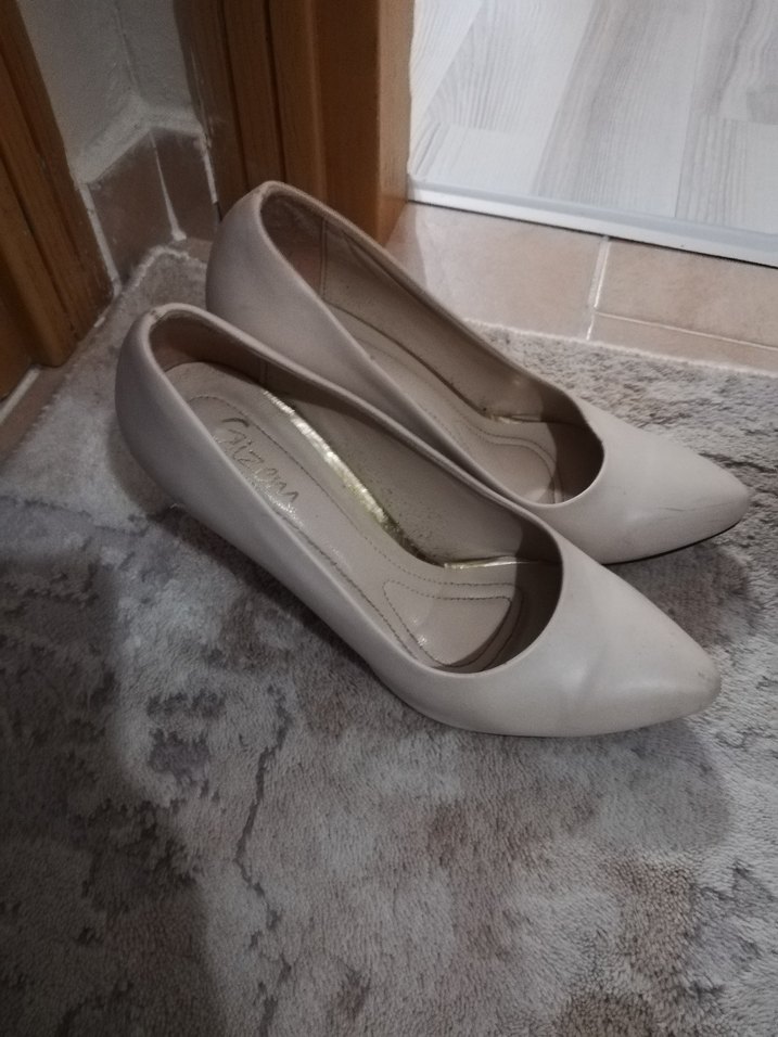 Bej renkte, kauçuk malzemeden yapılmış minimalist stiletto topuklu kadın ayakkabı. Ofis için uygun, desensiz ve normcore tarzda, zahmetsiz şıklık sunar.