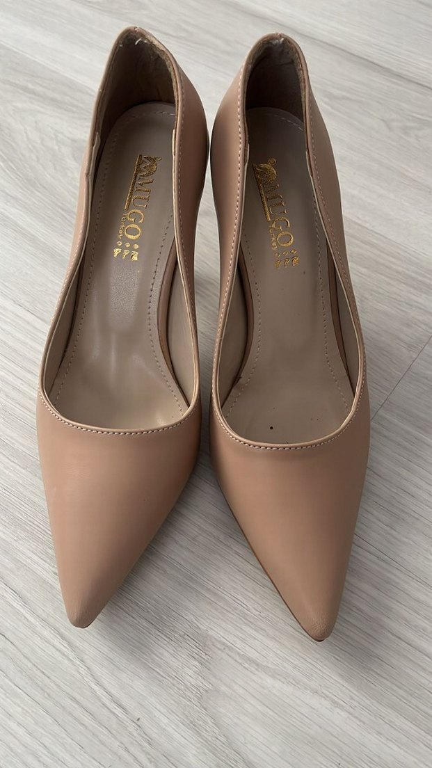 Bej renkte, sivri burunlu ve modern klasik tasarıma sahip stiletto topuklu ayakkabılar. Ofis için uygun, Mamugo markalı.