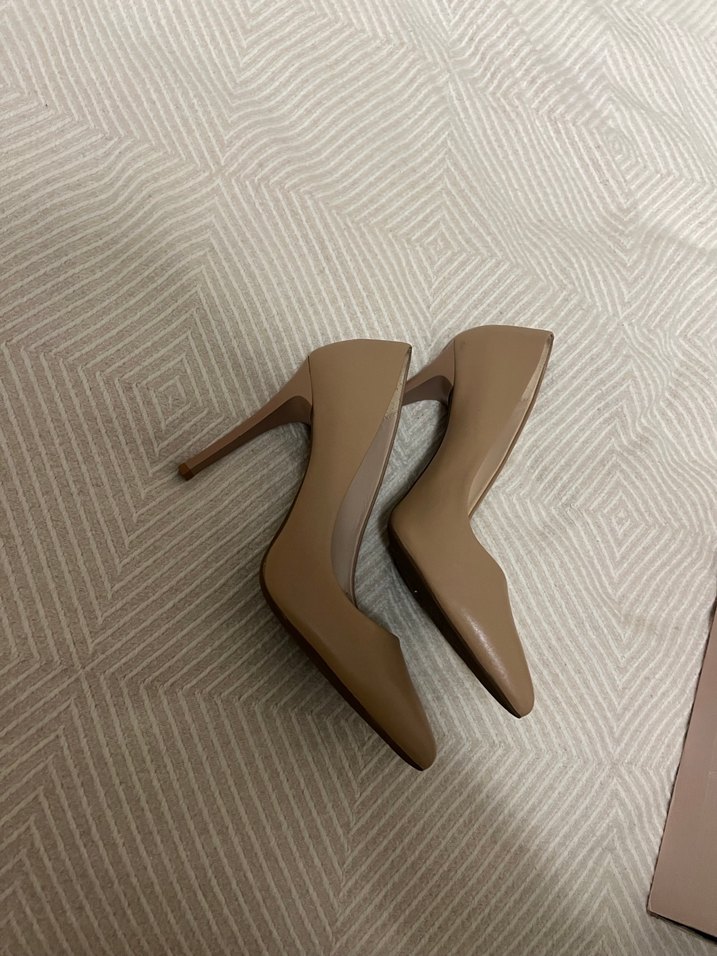 Bej renkte, lastik malzemeden yapılmış minimalist stiletto topuklu ayakkabılar. Ofis için uygun, çağdaş ve zahmetsiz şıklık sunar.
