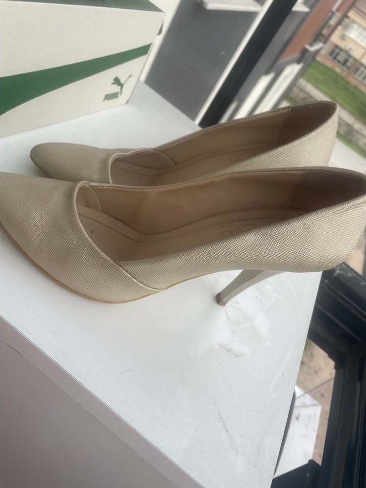 Bej renkte, minimal tasarımlı stiletto topuklu ayakkabı. Lastik malzemeden, ofis için rahat ve şık bir seçenek.
