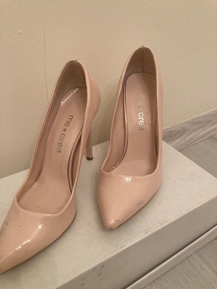 Bej renkli, lastik malzemeden yapılmış, desensiz ve klasik minimalist tarzda stiletto topuklu ayakkabılar. Mecrea markalı, ofis için uygun, zahmetsiz şıklık sunar.