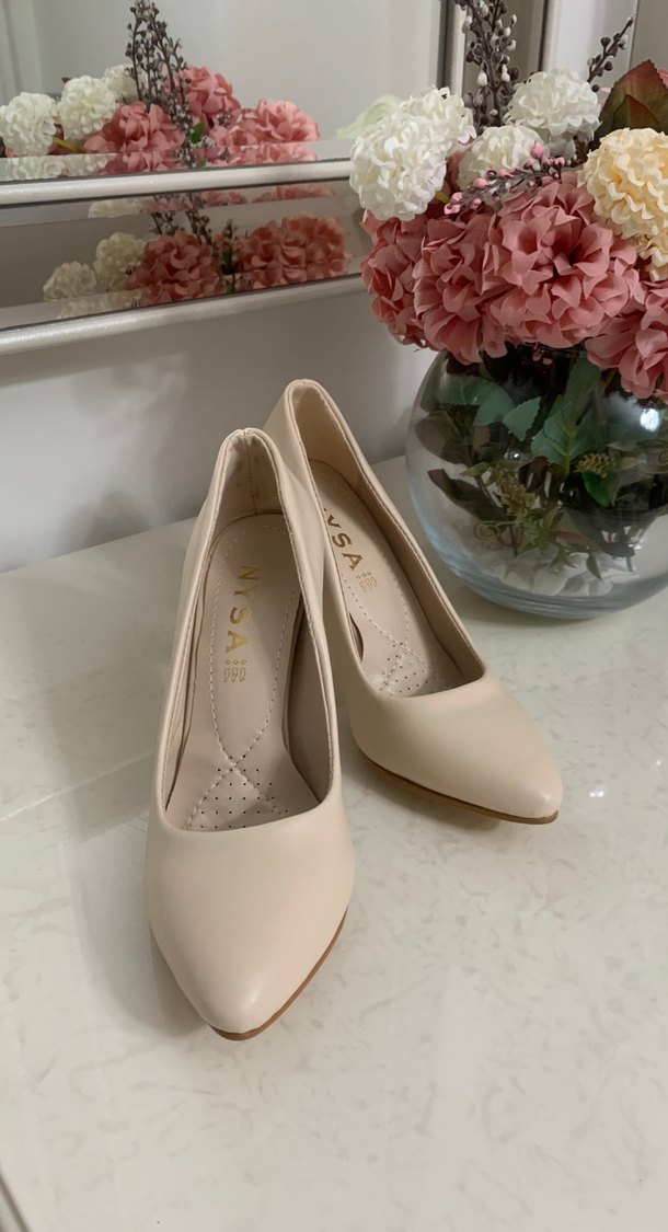 düz ve desensiz stiletto topuklu kadın ayakkabılar, kauçuk malzemeden yapılmıştır. Modern klasik tarzıyla çeşitli kullanıma uygundur. Düğün için aciliyetle numara tutmaz diye iki adet alındı. Olmayan numara elde kaldı. Sıfır hiç kullanılmadı.