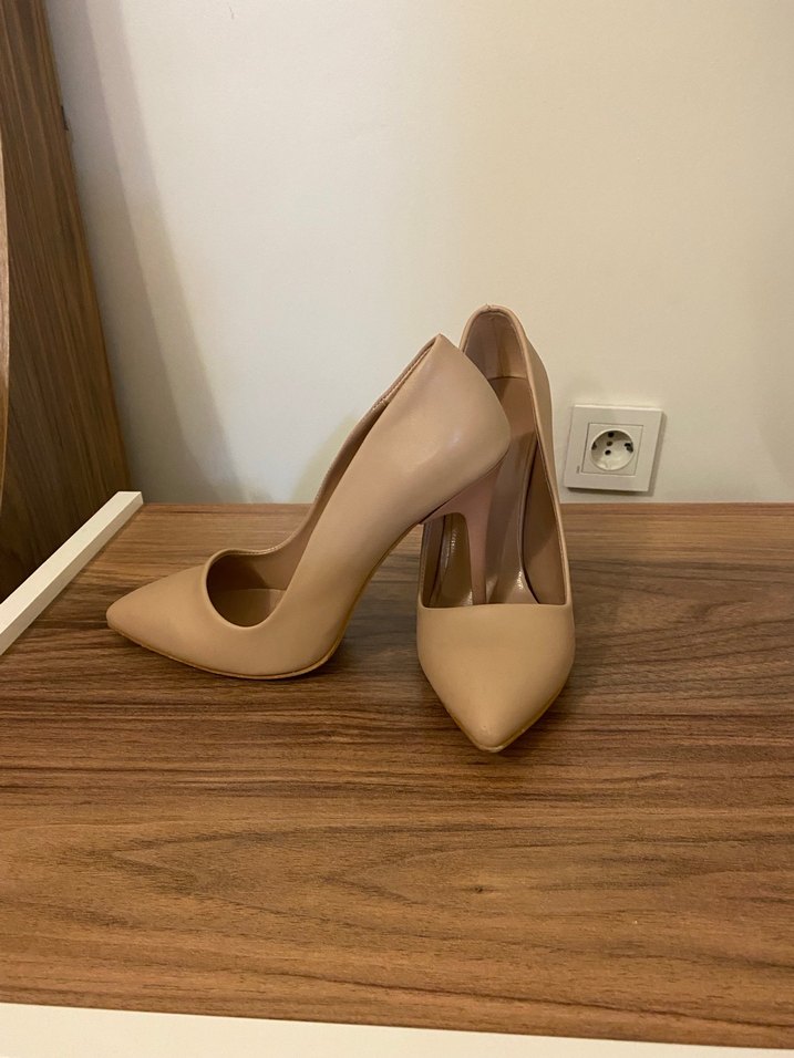 Bej renkte, minimalist ve desensiz tasarıma sahip stiletto topuklu ayakkabı. Kauçuk malzemeden, ofis kullanımı için rahat ve şık. Bir kere giyildi temiz deformesi yoktur.