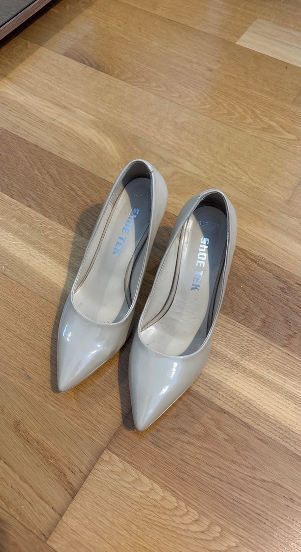 Bej renkli, minimalist ve desensiz tasarıma sahip lastik malzemeden kadın stiletto topuklu ayakkabılar. Ofis kullanımı için zahmetsiz şıklık sunar. Marka SHOE TEK. Lekeler var biraz üzerinde lostra halleder