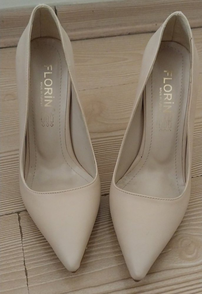 Bej renkte, şık tasarıma sahip, stiletto topuklu kadın ayakkabı. Desensiz, minimal ve klasik şıklık sunar, ofis için uygundur. Marka: FLORIN.