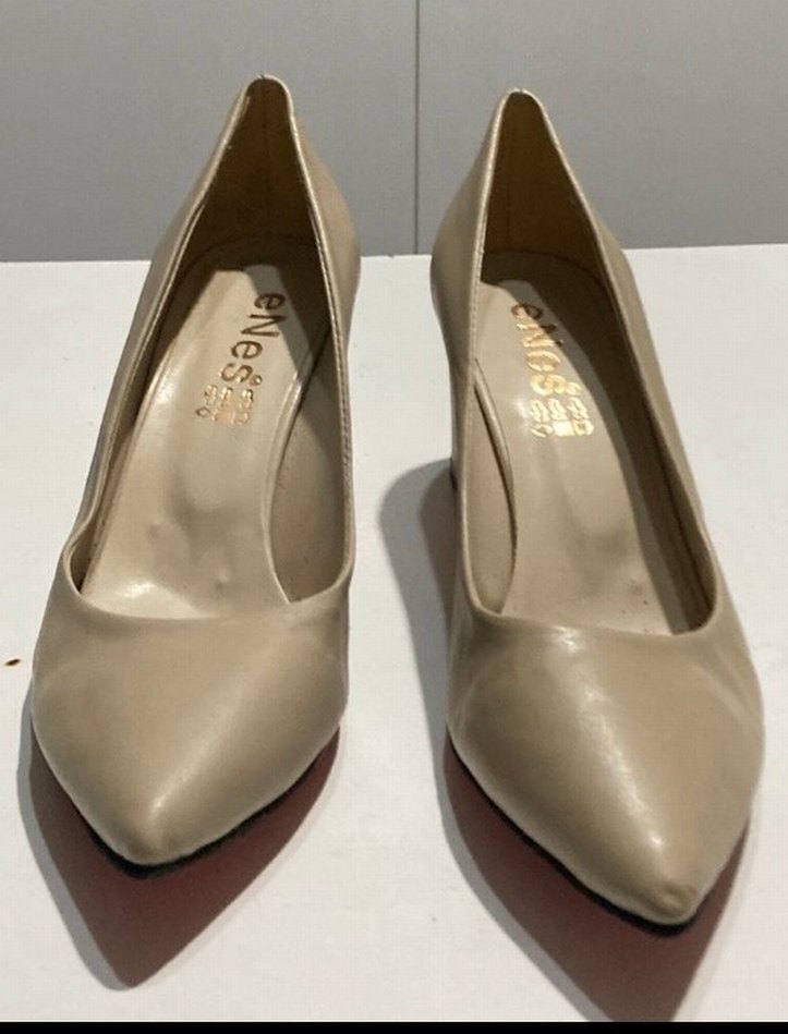 Bej renkte, düz yüzeyli, kauçuk malzemeden yapılmış stiletto topuklu kadın ayakkabı. Ofis için modern klasik tarzda, zahmetsiz şıklık sunar. Deri ayakkabı