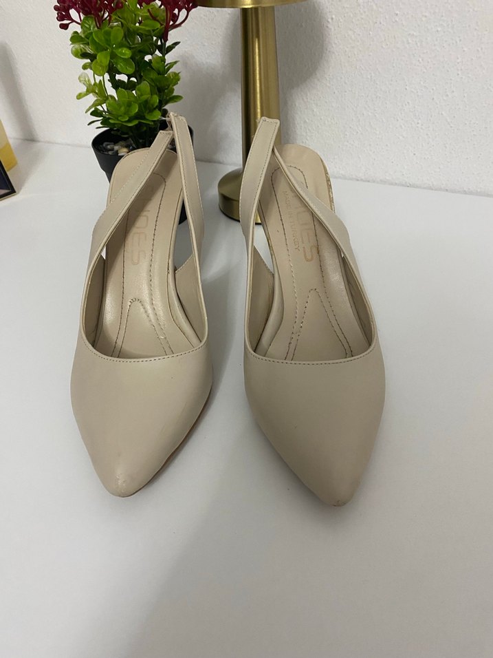 Bej renkte, tokalı bantlı stiletto topuklu ayakkabılar. Pastel tonlarda modern klasik tasarım, rahat kauçuk malzeme ile ofis kullanımı için uygun.