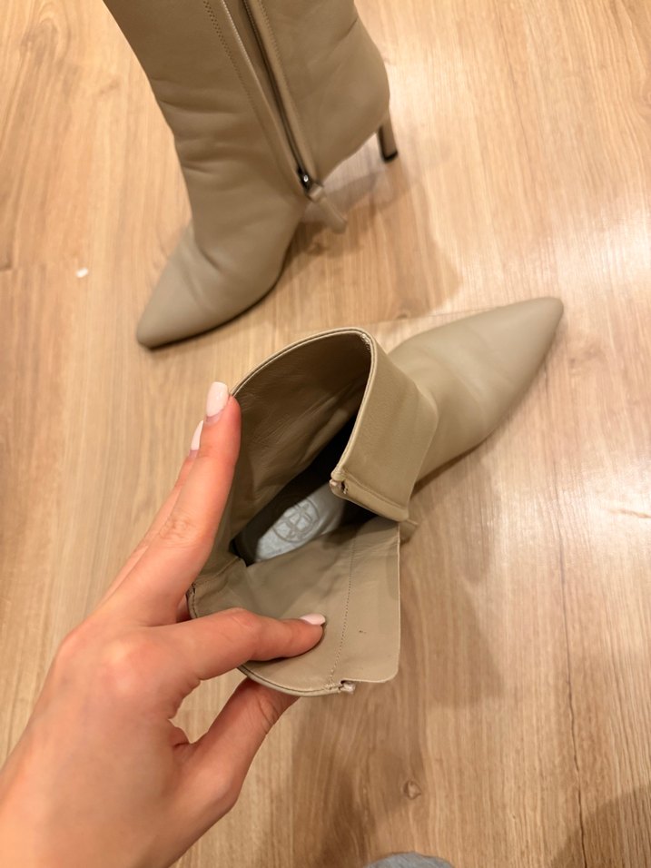 Bej renkte, fermuarlı stiletto topuklu kadın bot. Pürüzsüz kauçuk malzemeden yapılmıştır, trend günlük tarzlar için uygundur.