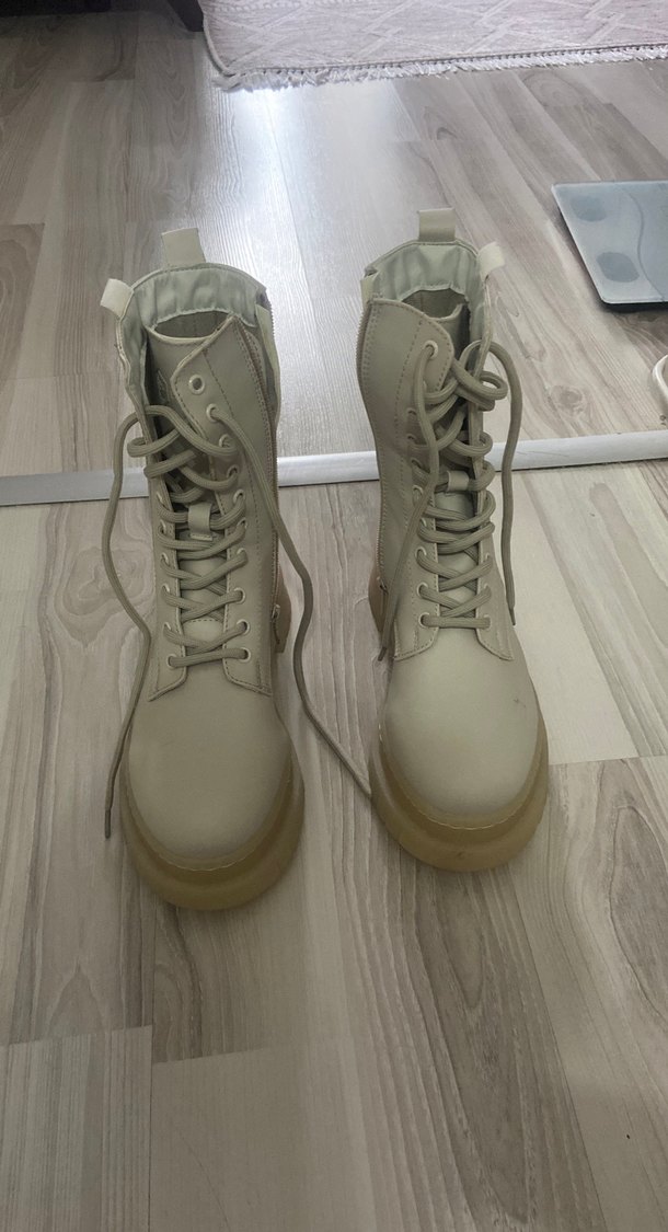 Bej renkte, lastik malzemeden yapılmış stiletto topuklu kadın botları. Desensiz ve günlük kullanıma uygun, sokak stili ile rahat şıklığı bir araya getirir.