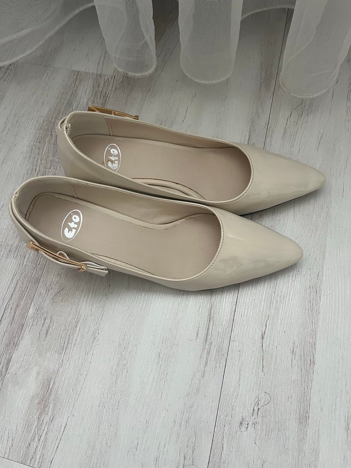 Bej renkte, tokalı stiletto topuklu kadın klasik ayakkabı. Kauçuk malzemeden üretilmiş, sivri burunlu ve desensiz tasarıma sahip, günlük kullanıma uygun.
