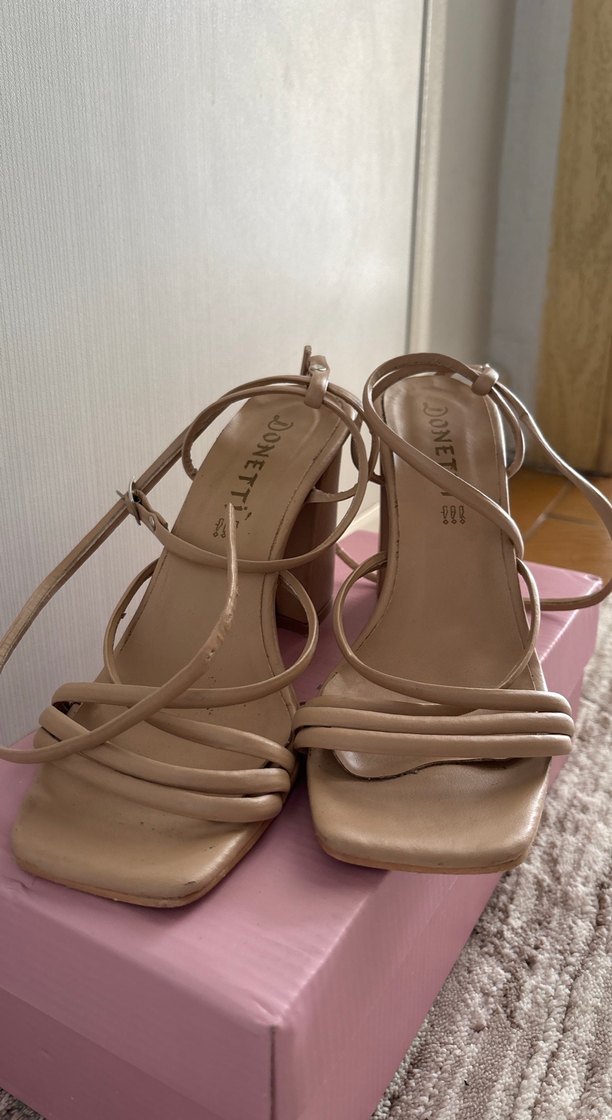 Bej renkte, tokalı kayışlara sahip, yumuşak kauçuk malzemeden bohem tarzda stiletto topuklu kadın sandalet. Günlük kullanıma uygundur.