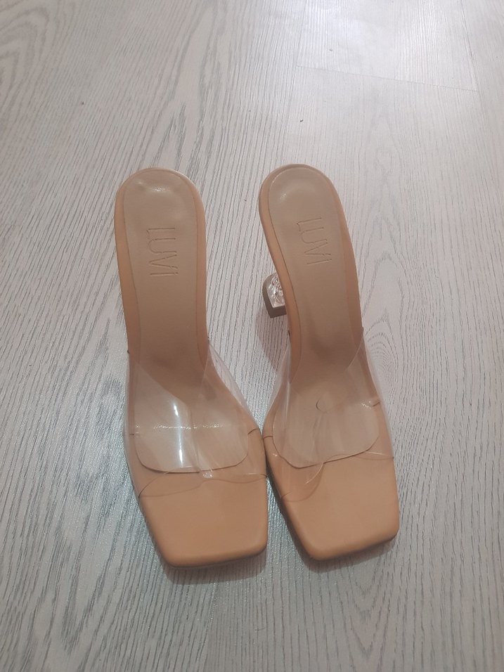 Bej renkte, şeffaf bantlı ve yumuşak kauçuk tabanlı stiletto topuklu kadın terlik, çağdaş ve minimal tasarımıyla günlük kullanıma uygundur.
