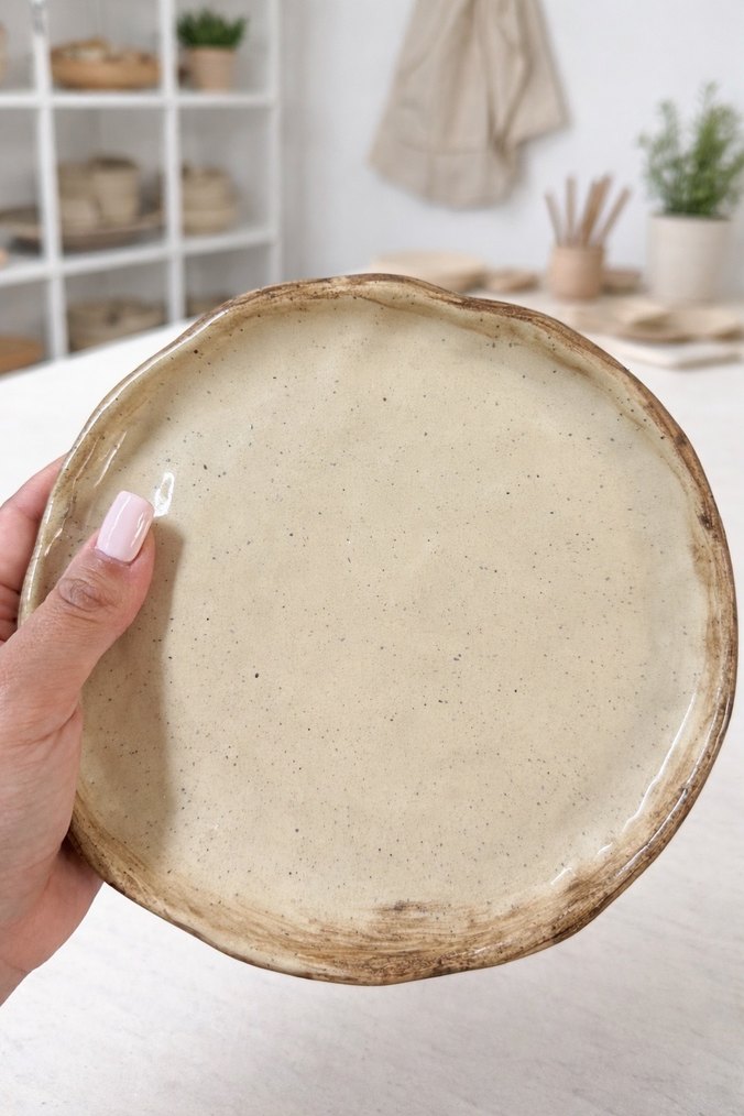 Bej seramik tabak, parlak yüzeyli ve hafif rustik kenarlı, yiyecek servisi için uygundur. ️