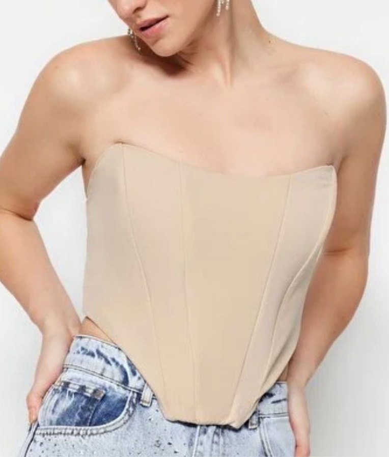 Bej renkli, straplez yakalı ve ince askılı, sentetik kumaştan yapılmış, vücuda oturan midi boy büstiyer. Günlük kullanıma uygun şık sokak stili.