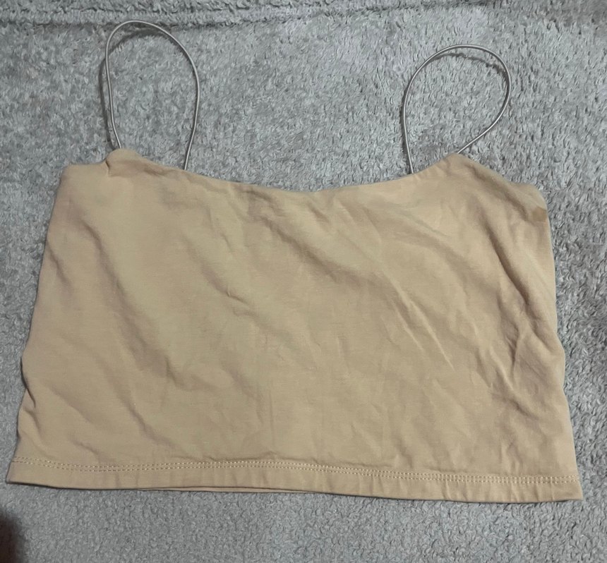 Düz bej renkli, ince askılı, vücuda oturan sentetik kumaştan yapılmış kadın atlet. Günlük sokak stiline uygun, rahat ve sade tasarım.