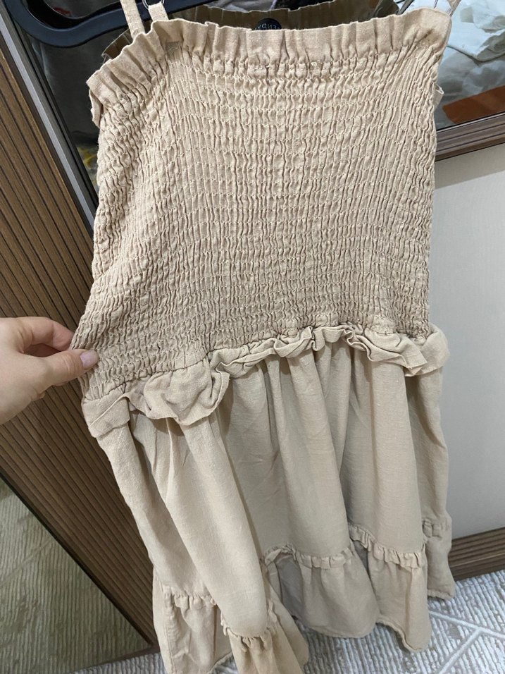Bej renkte, straplez ve keten kumaştan yapılmış, bol kesim ve fırfır detaylı midi elbise. Bohem tarz için uygundur.